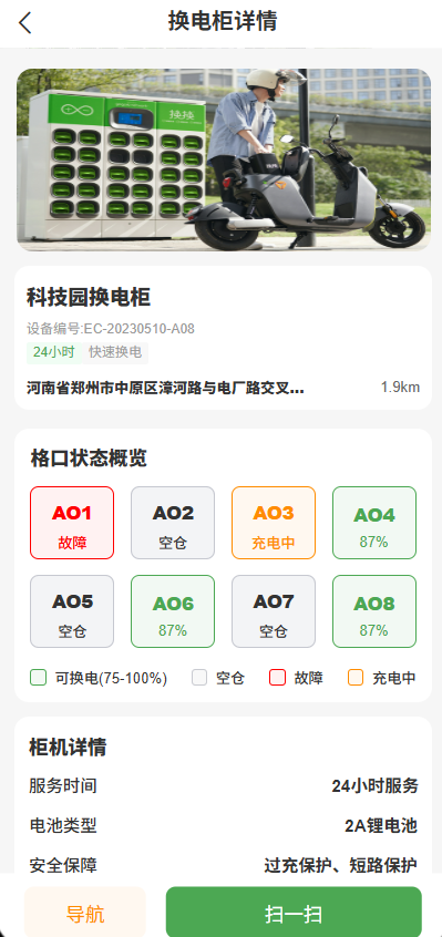 平台覆盖城市社区、商圈、站点、写字楼、配送网点等高频场景,用户可通过 APP 实时查看附近换电柜位置、电池电量、可用柜口,一键导航前往,扫码即可完成电池更换,无需等待充电。系统支持智能监控、异常报警、电池定位、轨迹追踪、故障自检等功能,保障电池使用安全与运营稳定。
